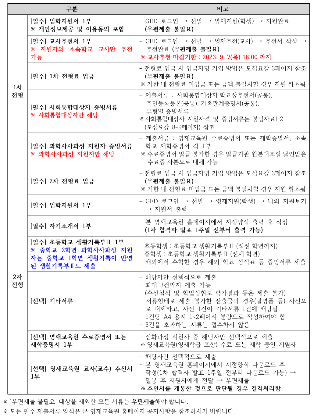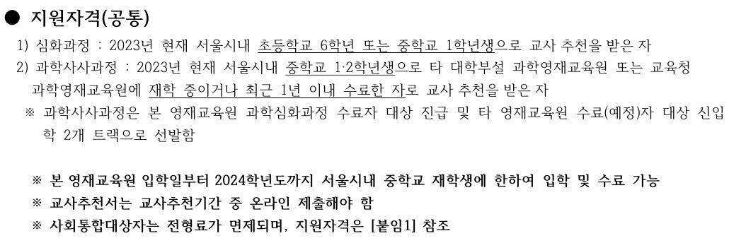 심화과정은 2023년 현재 서울시 초등학교 6학년 또는 중학교 1학년이 GED를 통해 지원할 수 있으며, 접수기간은 9월 4일부터 7일 17시까지입니다. COVID-19 이후 생략하고 있었던 지필(영재성 및 창의성 검사)를 9월 16일(토)에 시행한다고 안내하였습니다.
