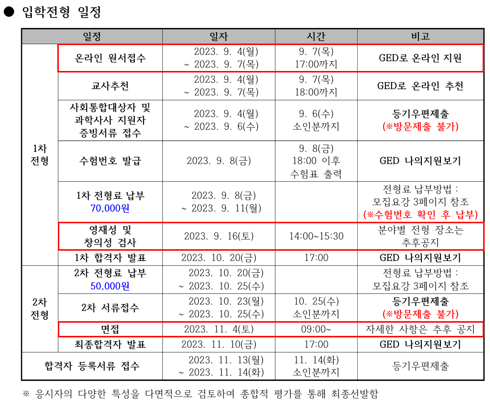 제출 서류는 1차와 2차 전형 시기에 따라 나누어 제출하며 일부는 우편제출이니 마감일에 주의가 필요합니다. 면접대상자가 제출하는 2차 서류 중 자기소개서는 홈페이지 양식에 따라 자필로 작성해야하며, 면접은 11월 4일(토)에 실시합니다.